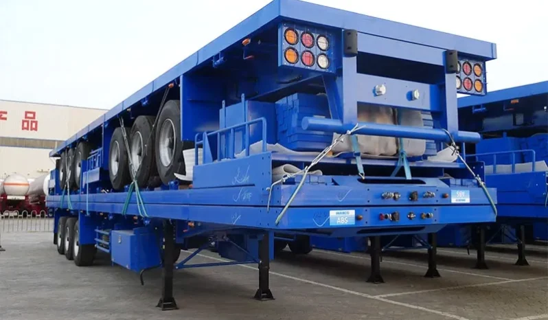 Flatbed container semi trailer is dedicated to transporting various containers, and can also be used to transport ordinary growing goods with its platform. It has sufficient strength and is mainly used in transportation systems such as ships, ports, routes, roads, transfer stations, bridges, tunnels, multimedia transportation systems, etc.